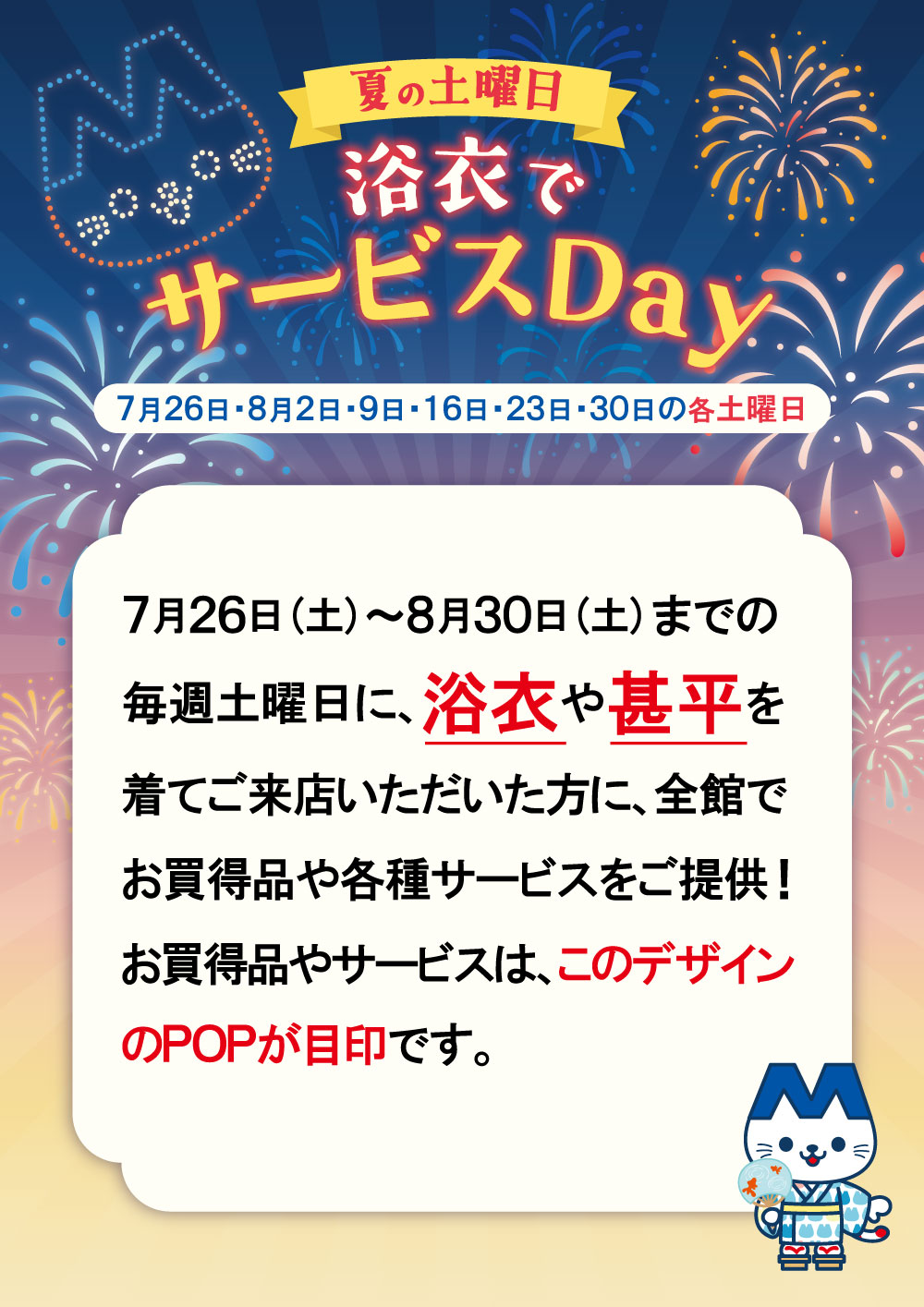 毎週土曜日に、浴衣 または 甚平 を着てご来店いただいた方に、全館でお買得品や各種サービスをご提供!