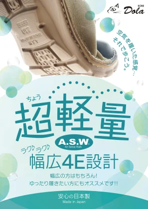 コンセプトは「思わず笑顔になる靴」。独自設計の軽量ソールと幅広設計により、快適な履き心地と足へのやさしさを両立しました。