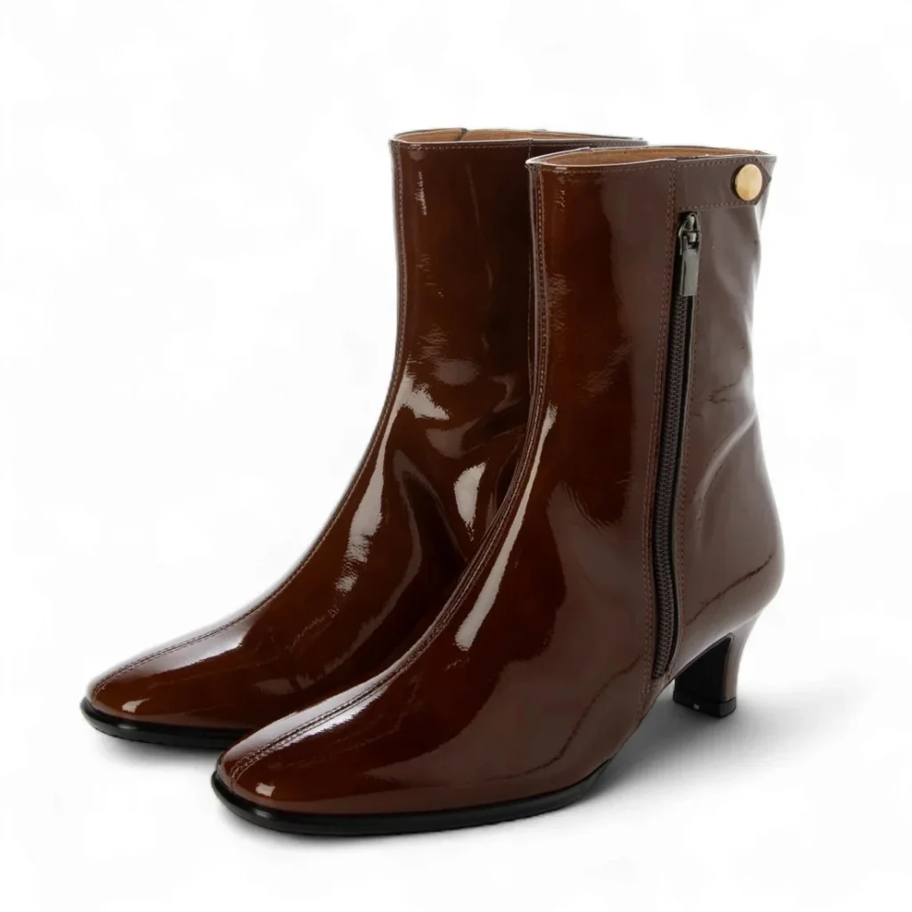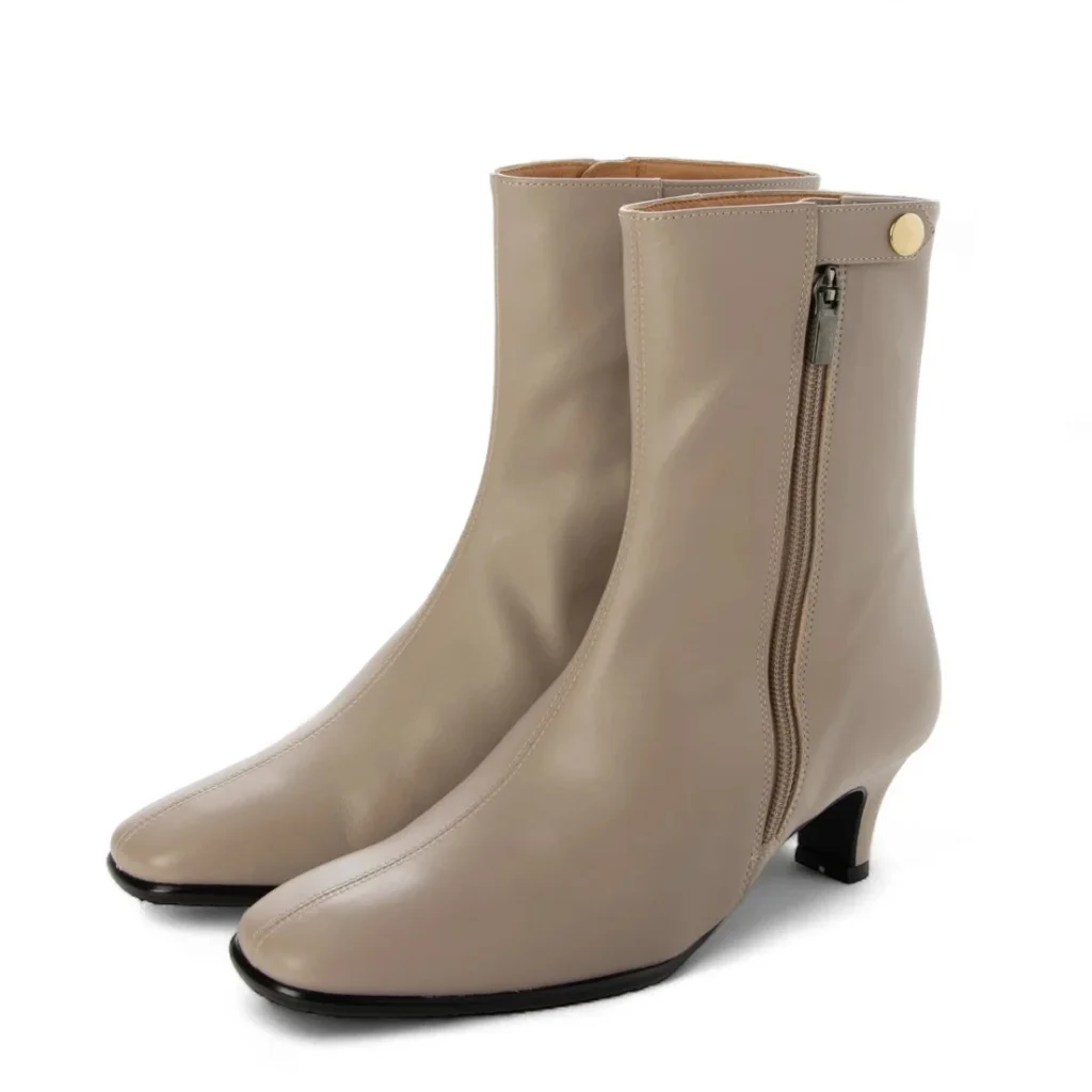 長めの丈感で外ファスナーがアクセントのエレガントショートブーツ。防水加工。ヒール5cm。