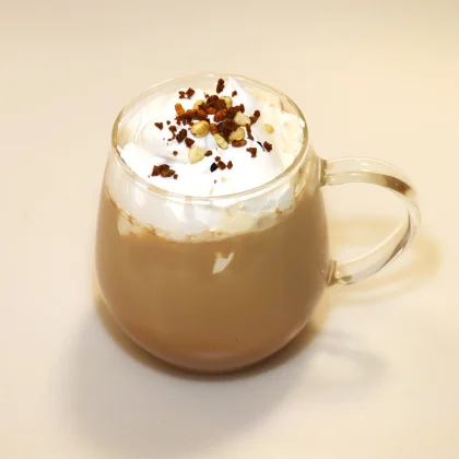 仕上げにふんわり豆乳ホイップをのせ、はとむぎグラノーラとチョコクランチ仕上げにふんわり豆乳ホイップをのせ、はとむぎグラノーラとチョコクランチで食感も楽しい一杯。優しい甘さと香ばしさが広がる、心も温まる季節限定ラテです。