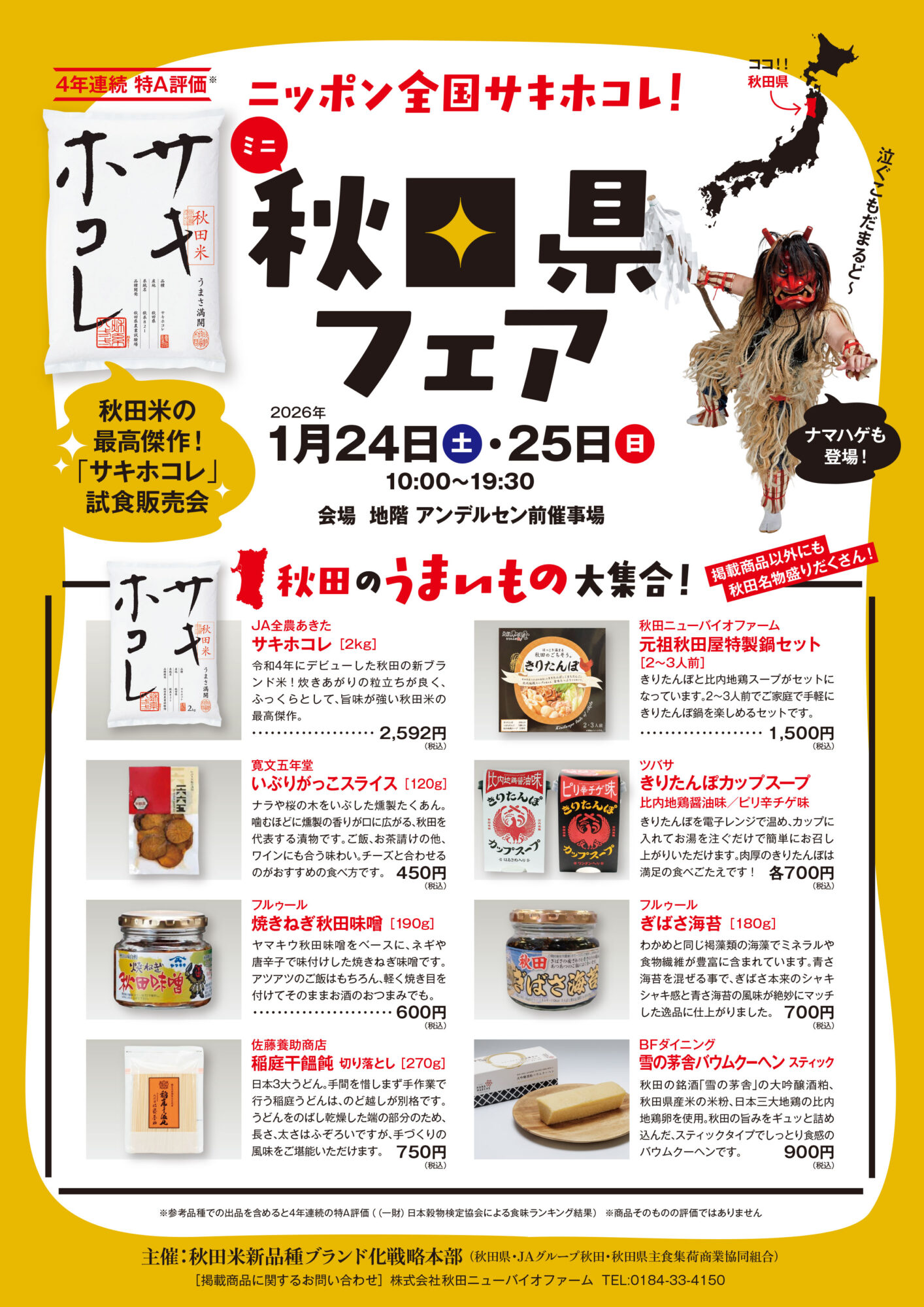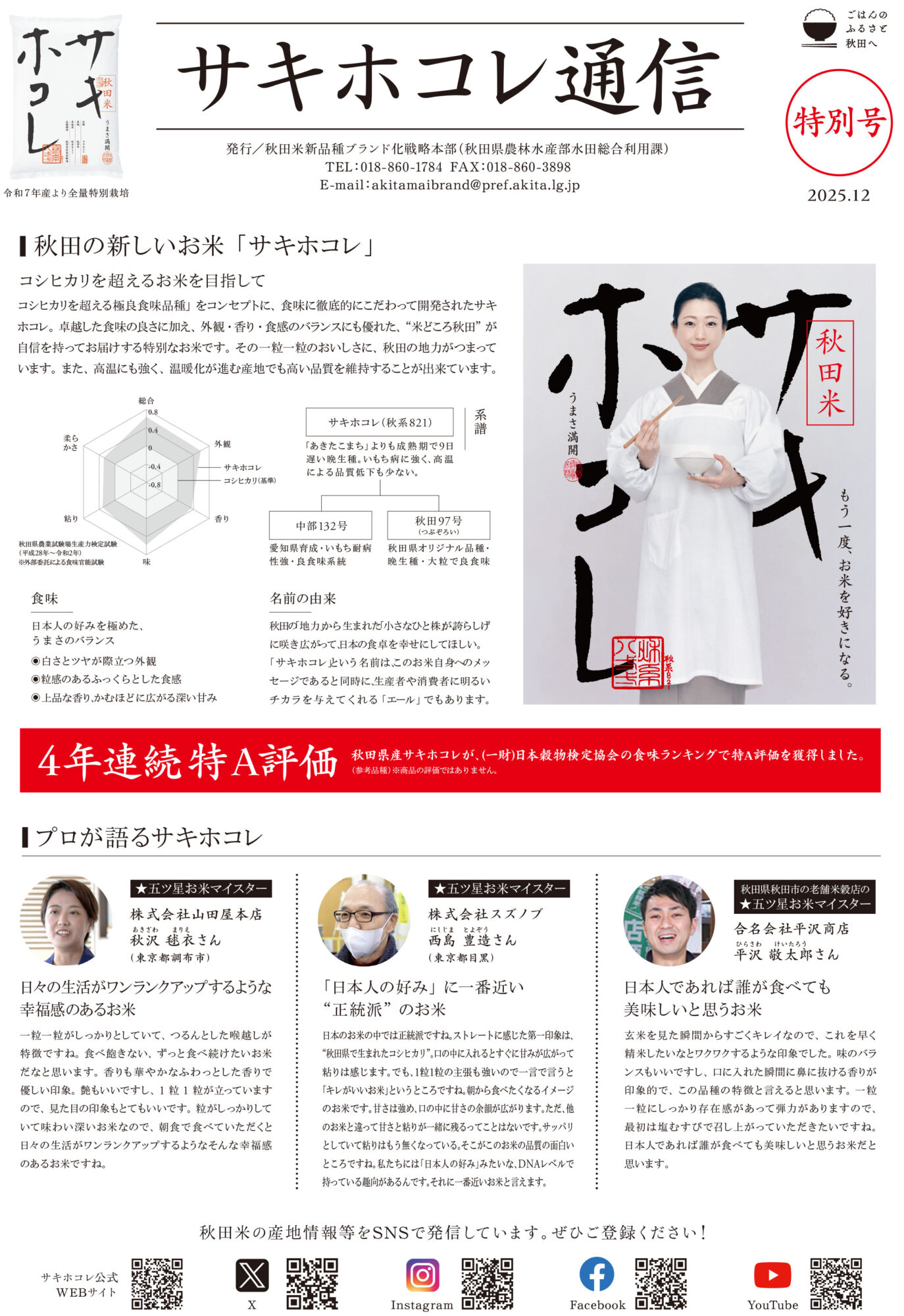 食味に徹底的にこだわって開発された秋田県の新品種米「サキホコレ」や、いぶりがっこなど、秋田県の名産品を試食を交えてご紹介します。