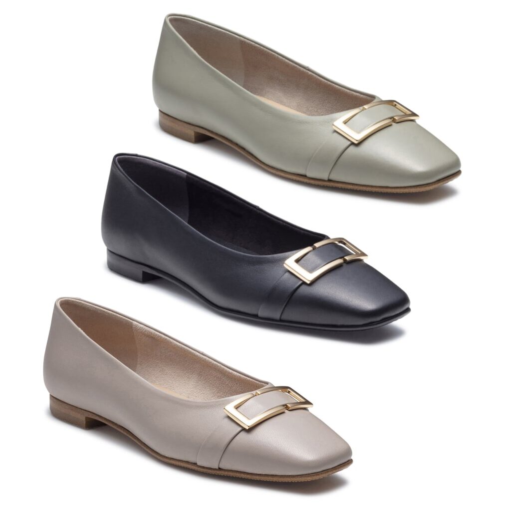 撥水機能を持たせた使い勝手のよいフラットパンプス。羊革で柔らかく、抜け気味のゴールドのバックルがかっちり過ぎない適度なカジュアル感を印象付けます。