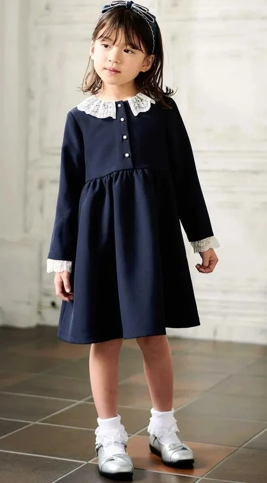 付け替え可能な襟がかわいい長袖ワンピース。落ち着いた濃紺でフレッシャーズにぴったりです。