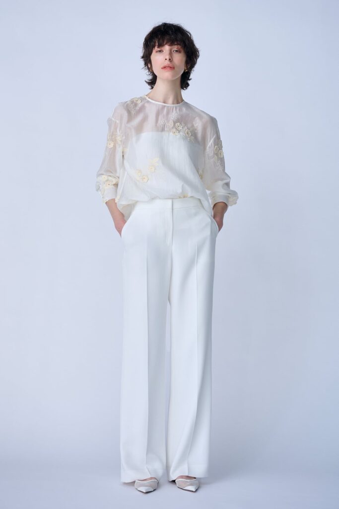 イタリアMTP社作られたエンブロイダリーレース。透け感のあるローン生地に立体感のある刺繍を施し、繊細で奥行きのある表情にシアーなトレンド感をプラスしたブラウスです。