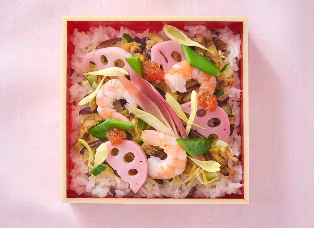 上品な味付けと盛り付けで桃の節句を彩る女の子の健やかな成長を願った梅の花のお弁当とちらし寿司。素敵なお祝いの席にぜひご賞味くださいませ。