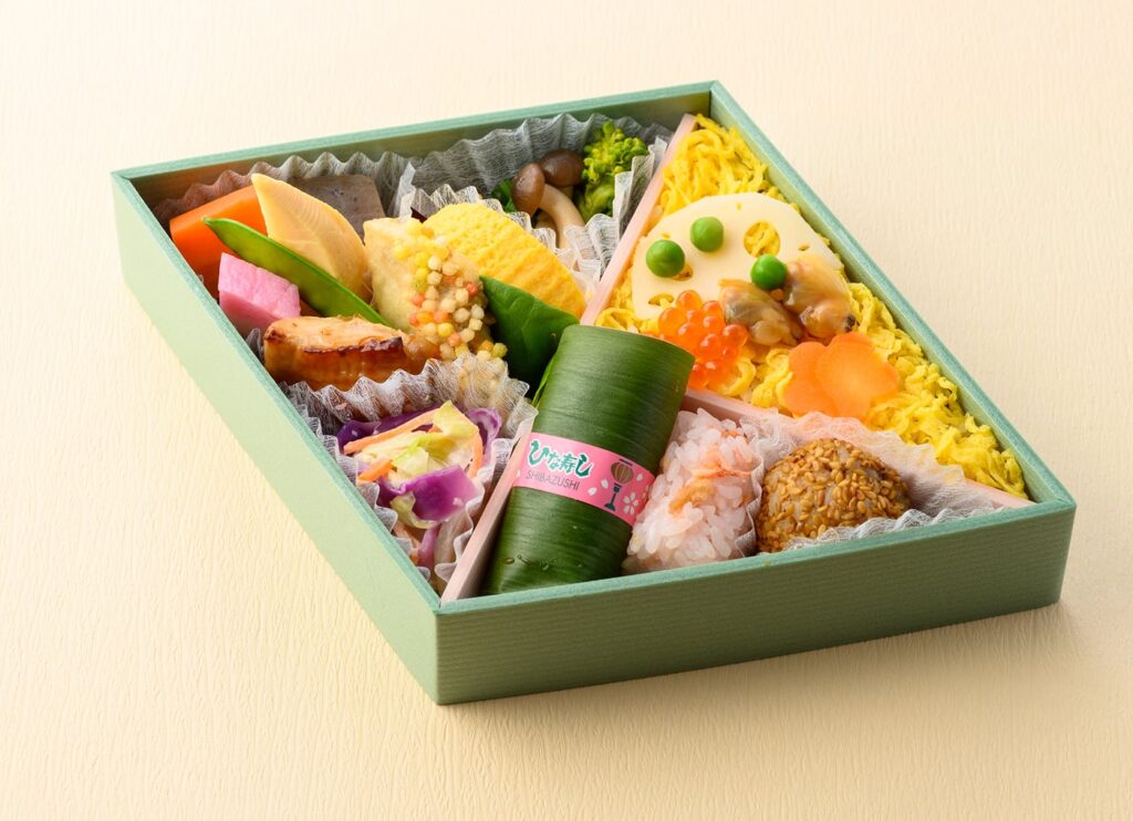 女の子の成長を慶び祝う「ひな祭り」にぴったりのお弁当。桃の花がデザインされた可愛らしいひし餅型のパッケージが気分を華やかに盛り上げてくれます。