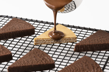 クリームをサンドしたサクサクの生地をチョコで包みました。