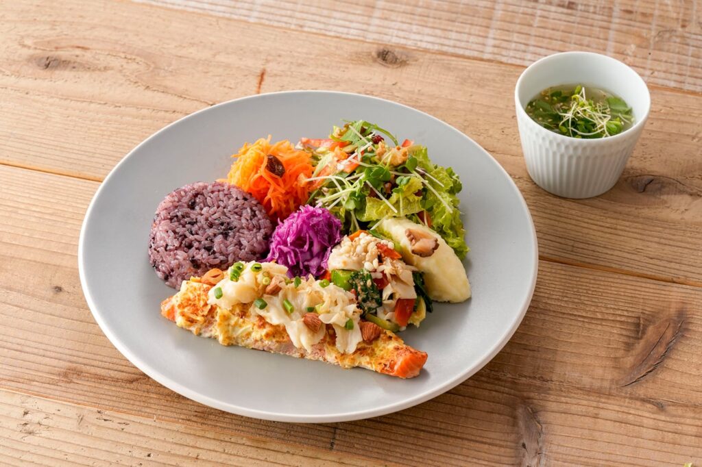 ハナビラタケとサーモンのキャベツマヨローストをメインに、小松菜のゴマ味噌マリネを添えた栄養バランスの良いワンプレート。