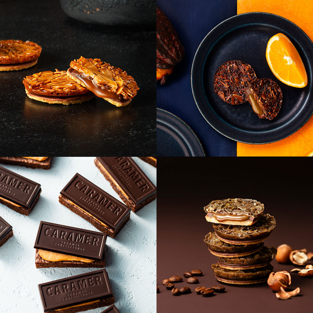 定番商品「キャラマーサンド」に期間限定の味「キャラマーサンド オレンジカカオ」、「キャラマーサンド ヘーゼルナッツカフェ」や「キャラメルブラウニー」を入れた詰合せです。