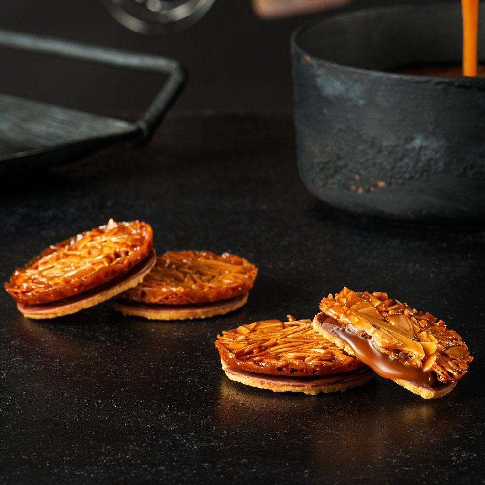 香ばしく華やかな甘さのアーモンドフロランタンとバターサブレで、とろけるキャラメルをサンドしました。