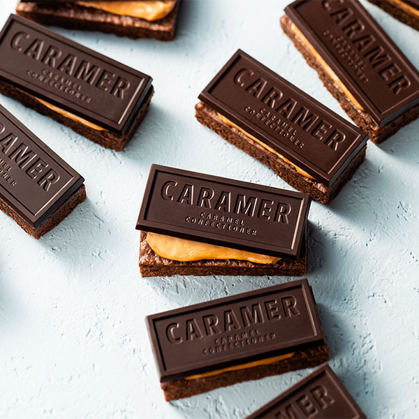 チョコレートの濃く、深い香りをしっかりと感じるブラウニーにミルキーで華やかな甘みのキャラメルクリームを重ね、ハイカカオチョコレートプレートで洗練されたカカオの香りと食感をプラス。