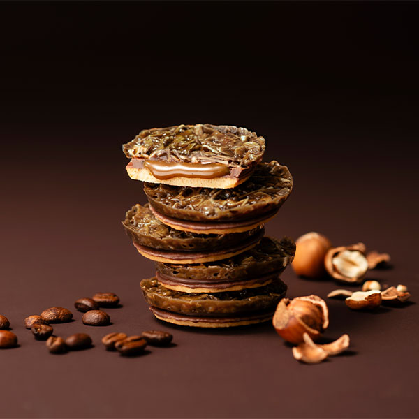 深煎りコーヒーを合わせて焼き上げたアーモンドフロランタンとバターサブレで、とろける食感のヘーゼルナッツキャラメルとミルクチョコレートをサンドしました。