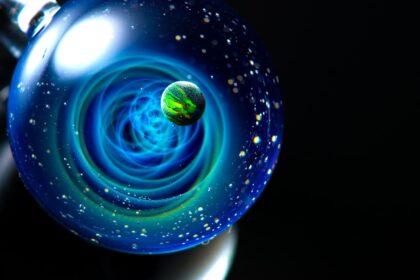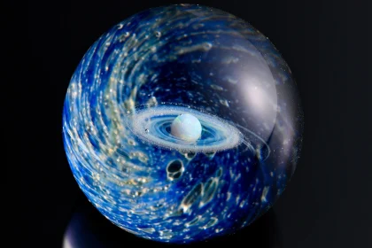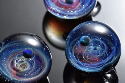 様々なガラスや金属、鉱石を幾重にも組み合わせた宇宙ガラス。
