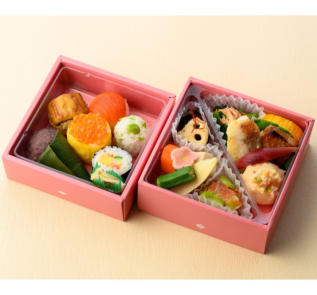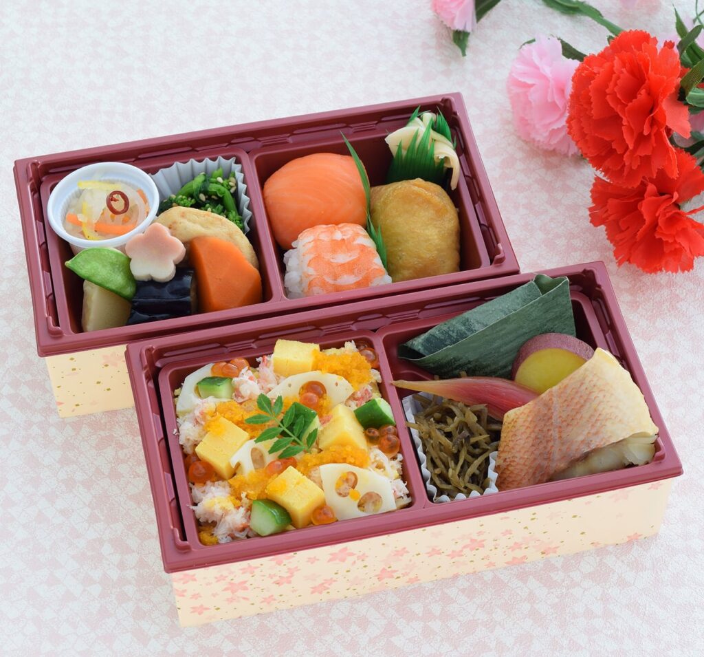 日頃の感謝の気持ちを込めて贈るお弁当。一口サイズのてまり寿司や季節のおかず、彩り豊かなちらし寿司などを盛り込んだ、寿司弁当です。