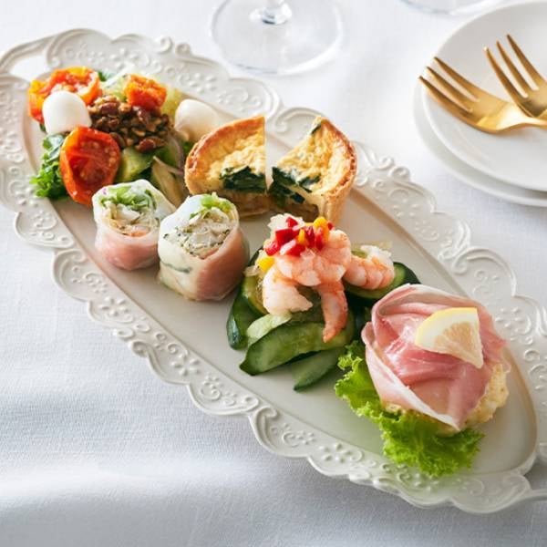 サラダや生春巻き、キッシュなど、肩肘はらずにワインを愉しみたい時におすすめな、冷製オードブルの盛り合わせ。