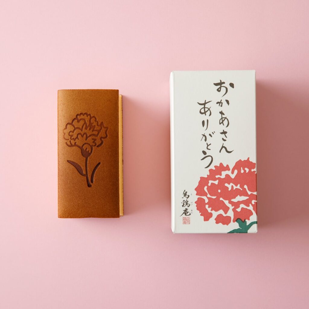 しっとり濃厚な味わいが魅力の「烏骨鶏かすていら」に、カーネーションの焼印が入った母の日限定商品。華やかなパッケージや母の日用の掛け紙もご用意しました。