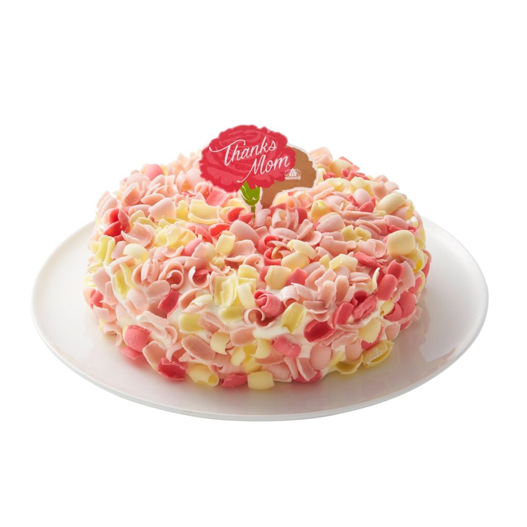 チョコレートスポンジで、チョコレートクリームとウォールナッツ(くるみ)をサンドし、クリームシャンティでナッペしたケーキを、白、ピンク、赤色の3色のチョコレートで包みました。カーネーションをイメージしたケーキです。