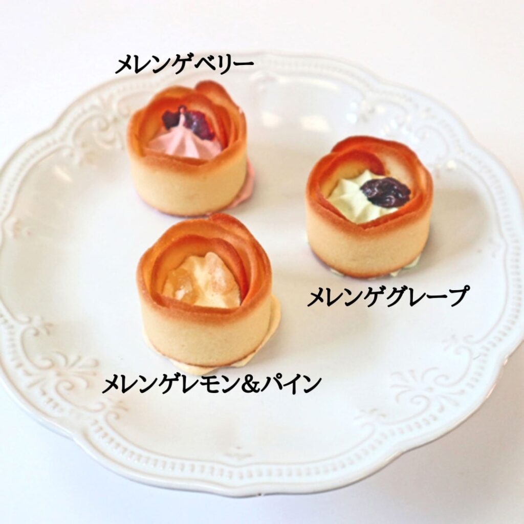 「お菓子で可愛らしい花を」をコンセプトにした花びら状に巻きあげたラングドシャクッキーを特別販売。メレンゲ生地を絞り、ドライフルーツをトッピングして焼き上げた可愛らしいクッキーです。