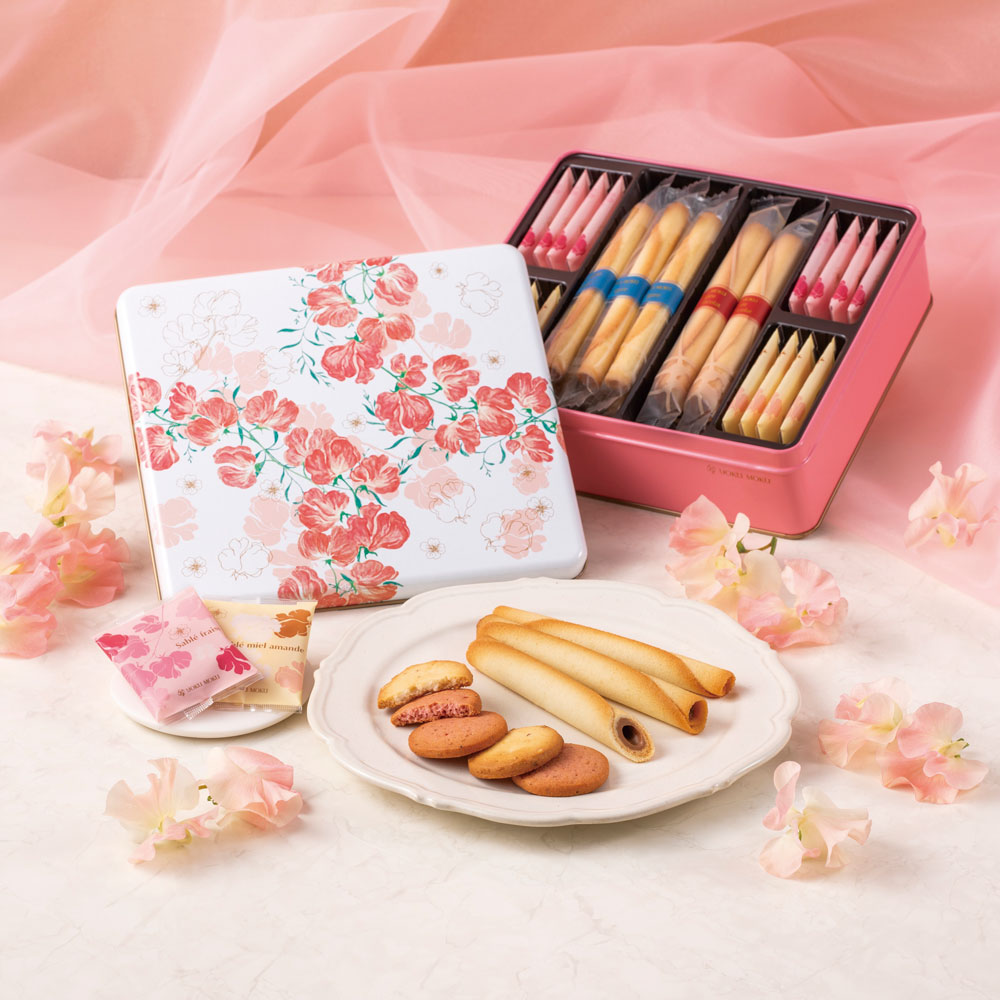花言葉に「やさしい思い出」を持つスイートピーをあしらったヨックモックの期間限定アソート。人気のシガール2種と限定フレーバーのクッキー2種を詰合せました。