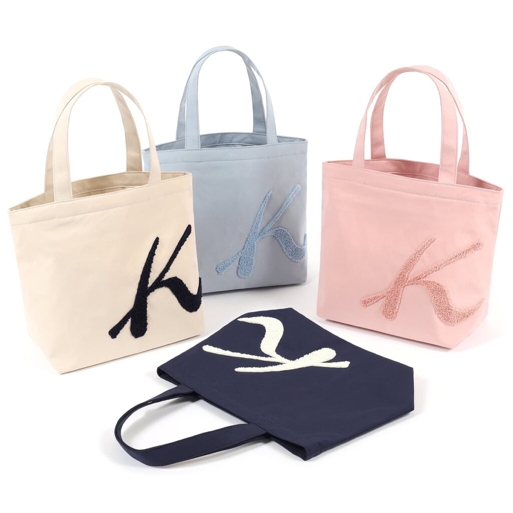 フロントにあしらったサガラ刺繍のKマークが印象的なハンドバッグ。本体はポリエステル素材を使用しており、軽量でサブバッグにもおすすめです。