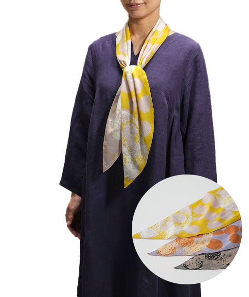 上等な薄手のコットンスカーフ。本体は表裏別の板の二枚仕立てになっていて、襟元にまとうほか、頭やウエストに巻いたり、バッグの持ち手に巻いたりと用途は多彩。