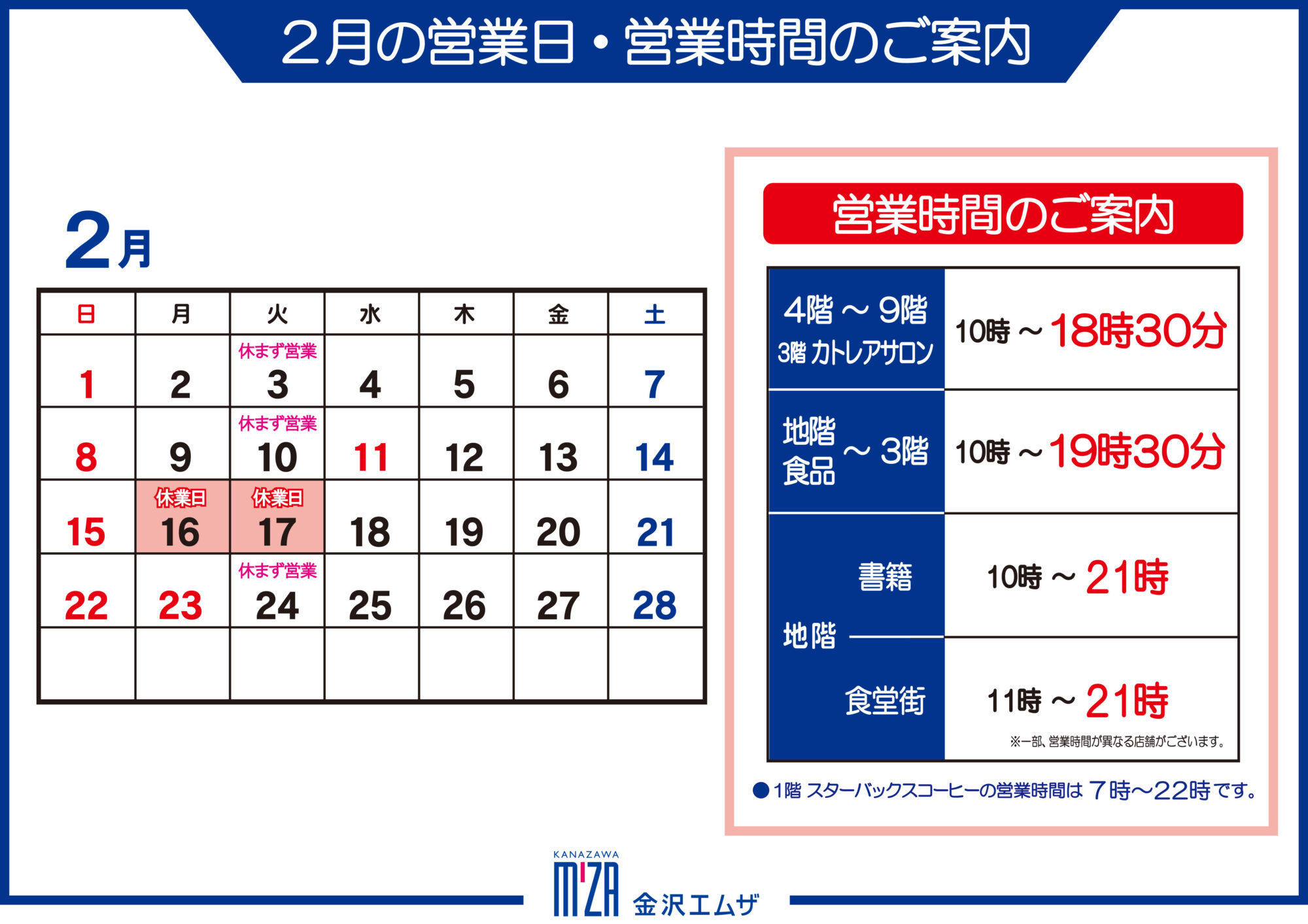 2月の店休日および営業日・営業時間カレンダー
