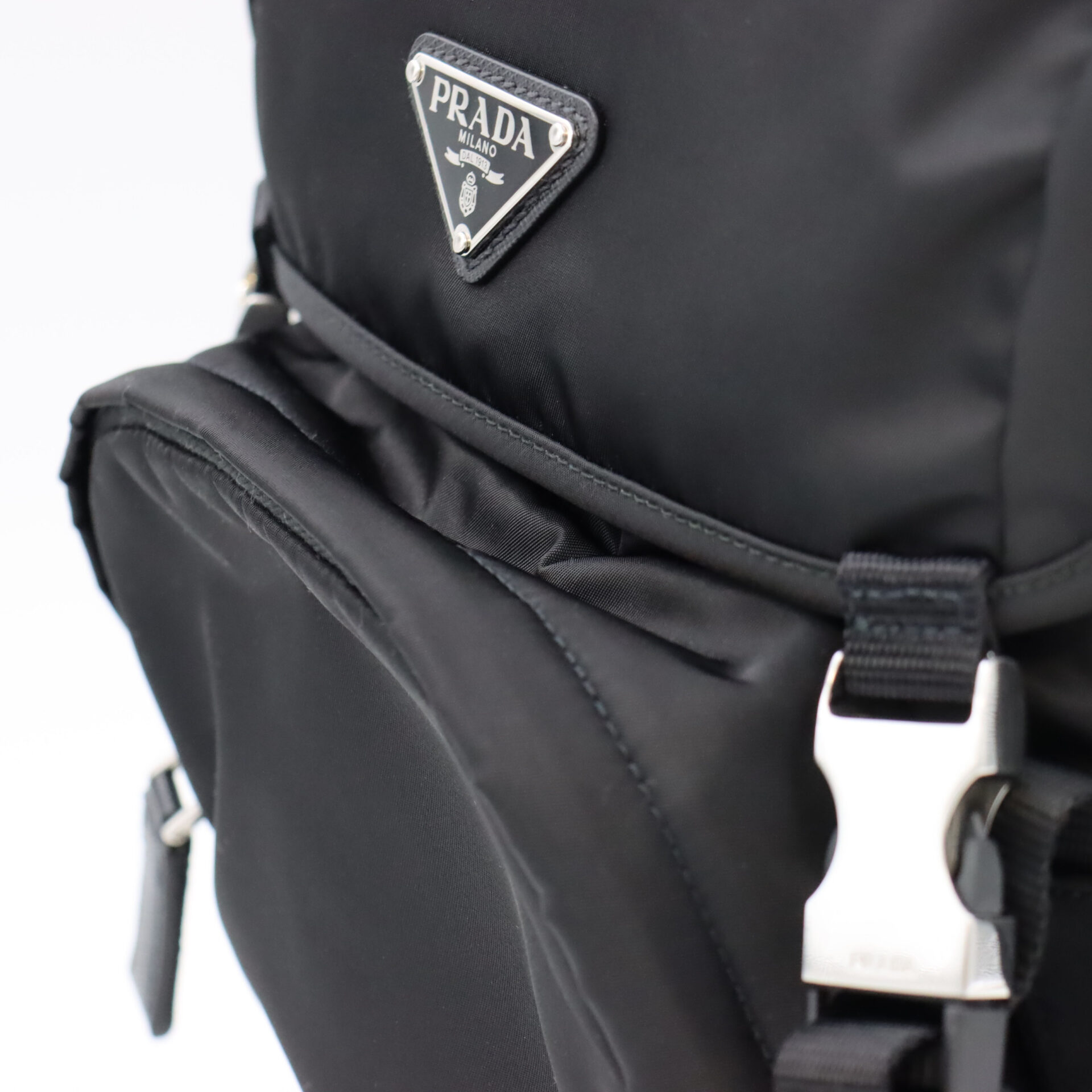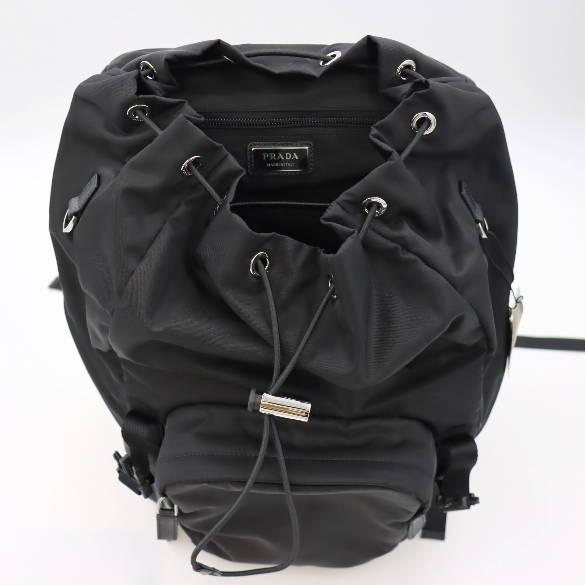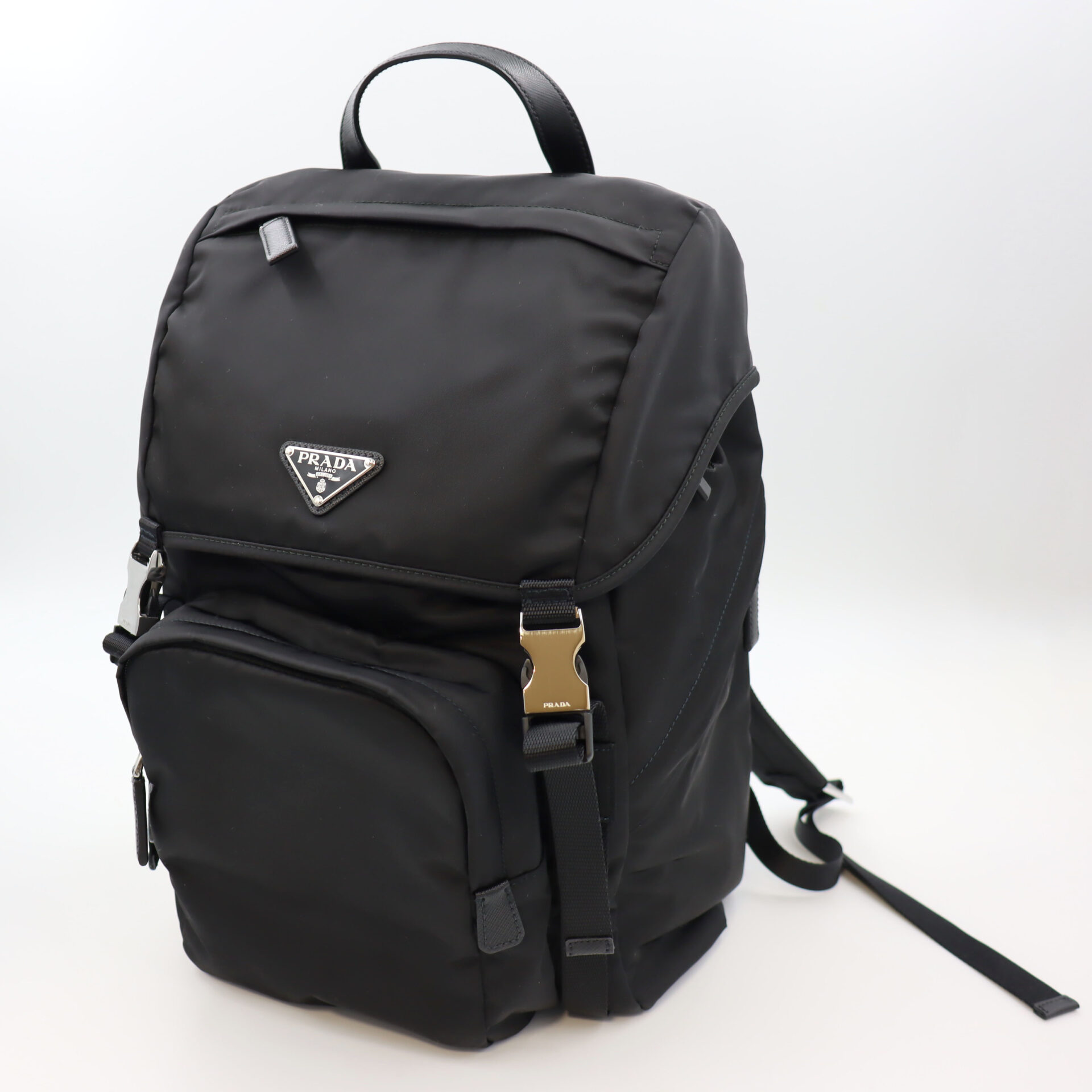ブラックのナイロン生地に、トライアングルロゴがワンポイントになったシンプルなリュックサックです。